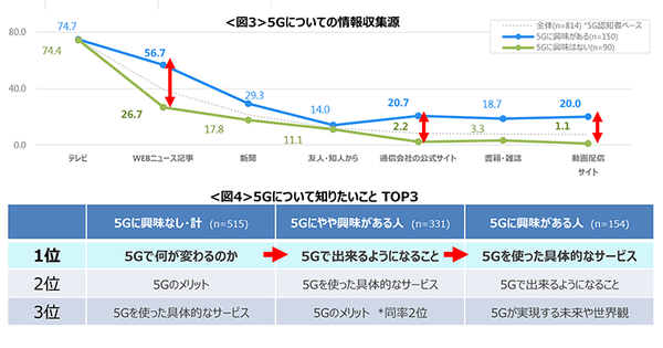 なお「5Gについて知りたいこと」についても聴取したところ、5Gに関心がない層では「5Gで何が変わるのか」→やや関心がある層では「5Gでできるようになること」→関心がある層では「5Gを使った具体的なサービス」といったテーマがTOPにあがった。<図4>