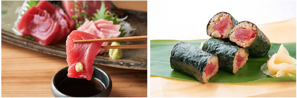 右:お造りでそのまま食べるのとはまた異なる美味しさが楽しめる鉄火巻き。赤酢を使ったシャリが南紀串本のこだわりです。