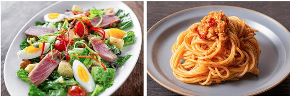 左:生まぐろのたたきを使ったサラダ仕立て。ほんのり火が通ったまぐろは、生で食べるのとはまた違った美味しさをお楽しみいただけます。