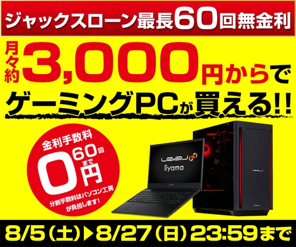 WEBでお申込できる便利なショッピングローン。ジャックスローンご利用のお客様に、最長60回まで分割支払い手数料をパソコン工房が負担します。欲しかったゲーミングPCが月々3,000円からでご購入いただけます。ぜひご利用ください。