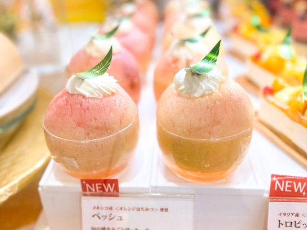 オレンジの花のはちみつを使った口溶けなめらかな桃ムースの上に、果実の甘みを引き立てるアガベシロップで仕上げた桃ジュレと、桃の果肉を贅沢に飾りました。