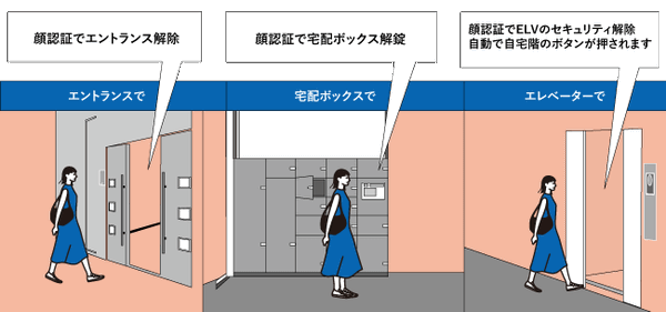 エントランス・宅配ボックスが顔認証で解錠!鍵を探す必要も、立ち止まる必要もありません。