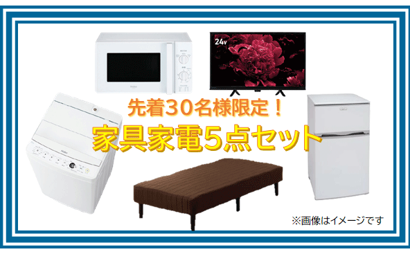 ご契約先着30名様限定・ひとり暮らしの家具と家電の5点セットをお付けします!