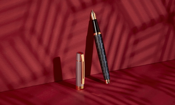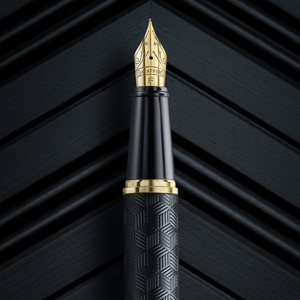 アート、建築、壁画などに見られる幾何学的な装飾にインスパイアされた「エングレーブド」がシェーファーの定番シリーズに加わりました。マットブラックの軸に特徴的なキューブパターンが彫刻された堂々とした佇まいの新作。光沢のあるクロームメッキのキャップと、ゴールドカラーのPVD加工が施されたステンレススチールのペン先が、ボディに刻まれた独特な模様を際立たせています。