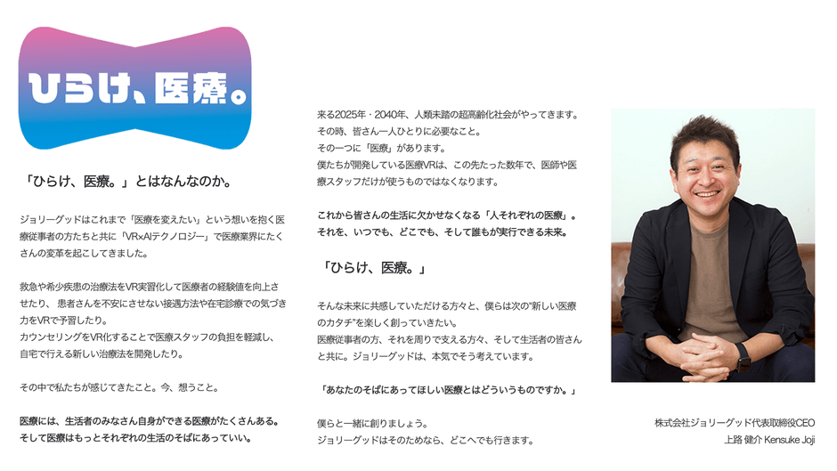 医療VRを開発・提供する株式会社ジョリーグッド(東京都中央区、代表取締役:上路健介、以下 ジョリーグッド)は、医療の明るい未来を創出する【『ひらけ、医療。』プロジェクト】を2023年11月1日(いい医療の日)に開始いたします。