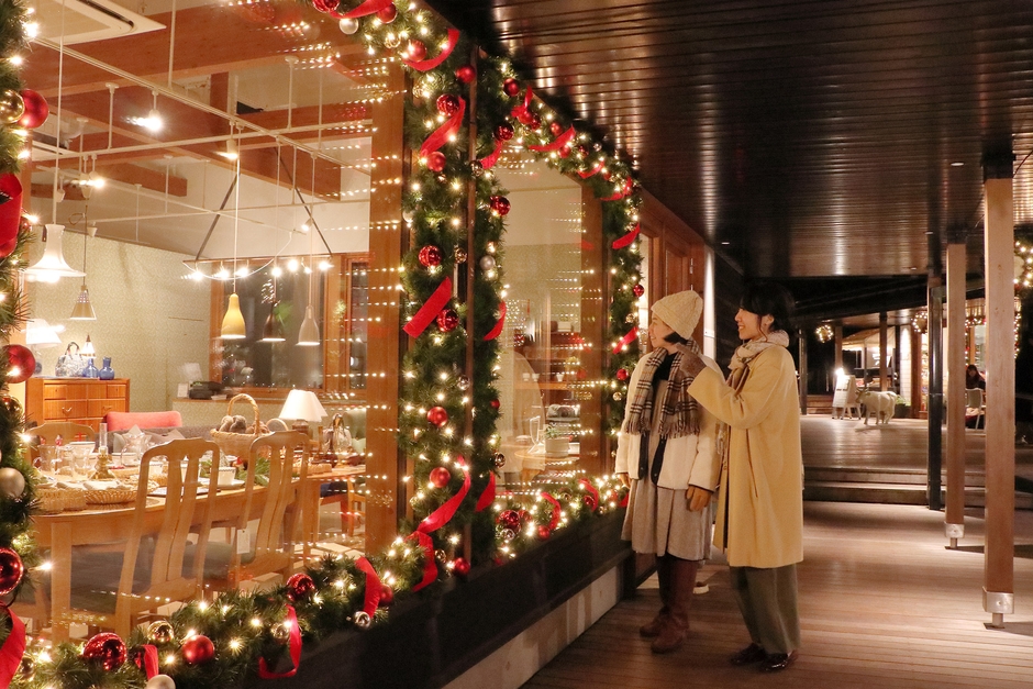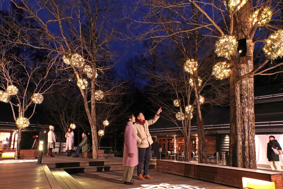星野エリアのクリスマスのシンボルツリーは、高さ10メートルの本物のもみの木です。「星野温泉 トンボの湯」に隣接する広場にあり、辺りをあたたかく照らします。大きく張り出した枝先にまで、イルミネーションを飾り付けているので、枝と枝の間に立つと星屑の中に紛れ込んだような、キラキラした写真を撮ることができます。また、星野エリアは、数多くのやどりぎが自生する森です。やどりぎは冬でも枯れることなく緑の葉を保つ植物で、西洋ではクリスマスに欠かすことのできない装飾のひとつです。永遠の命の象徴とされ、その下を通ると幸せが訪れるとも言われています。このやどりぎを象った球状のイルミネーションが、ハルニレテラスの木々にやさしく灯ります。