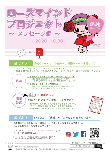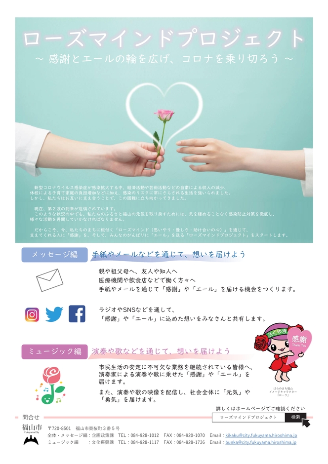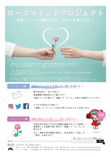 広島県福山市では,新型コロナウイルス感染症による困難を乗り越えていくため,支えてくれる人や応援したい人に「感謝」や「エール」を手紙などで送る「ローズマインドプロジェクト~メッセージ編~」を推進しているところです。