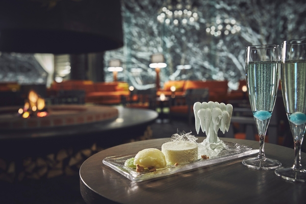 夕食後には、プラン限定「氷瀑スイーツ」を提供します。青みがかったメレンゲで氷瀑を、リンゴムースやシナモン風味のクランブルで、雪化粧した岩や渓流に点在する雪の綿帽子を表現したデザートです。さわやかなリンゴムースと、中に入ったカシスのジュレの甘みがよく合い、氷瀑をイメージしたシードルとの相性も抜群です。