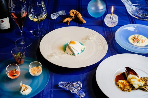 プランの目玉である「氷瀑ディナー」は、旬の食材をふんだんに盛り込んだオードブルヴァリエ(*2)から始まり、時間を気にせず客室でゆっくりと楽しめるプラン限定のコース料理です。白銀の世界に現れる氷瀑をイメージしたデザート「ベイクドアラスカ(*3)」など、見た目も楽しめるメニューが並びます。