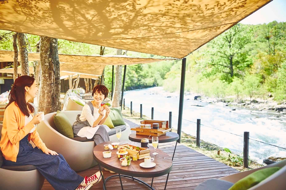 薄暮の奥入瀬渓流や森を眺めながらアペリティフを楽しめるのは、このレストランならではの体験です。その後、屋内のダイニングで、フランス料理の技法を使いながら、青森らしさを表現したコース料理を楽しめます。朝食は、渓流を眺めながら楽しめる「渓流テラス朝食」です。ボックスに入ったキッシュやサンドイッチ、スープの朝食で、ピクニック気分で朝のひと時を過ごせます。