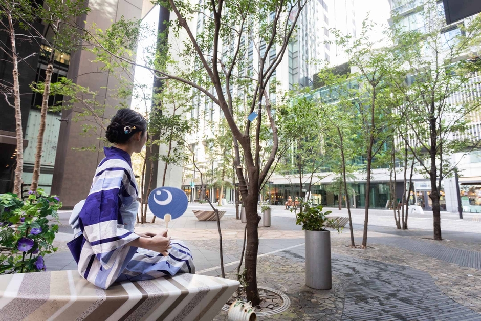 また、夕暮れ時には、星のや東京の玄関前で夕涼みをします。江戸の町の人々は、気温が下がる日暮れに、庭先や路地に涼み台を出し、涼をとっていました。本プログラムでは、風鈴の音を聞き、冷抹茶と白玉あんみつを味わいながら涼むことができます。