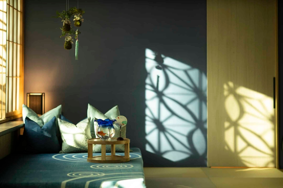 涼しげな藍染の布地を使用した客室には、江戸の人々が夏の時期に涼を感じるために鑑賞したと言われる金魚や釣りしのぶ、季節の草花が設えられます。人は青色を見ると水を連想し、脈拍や呼吸数、血圧が下がり、涼しく感じると言われています。(*2)