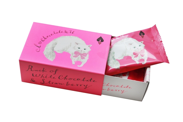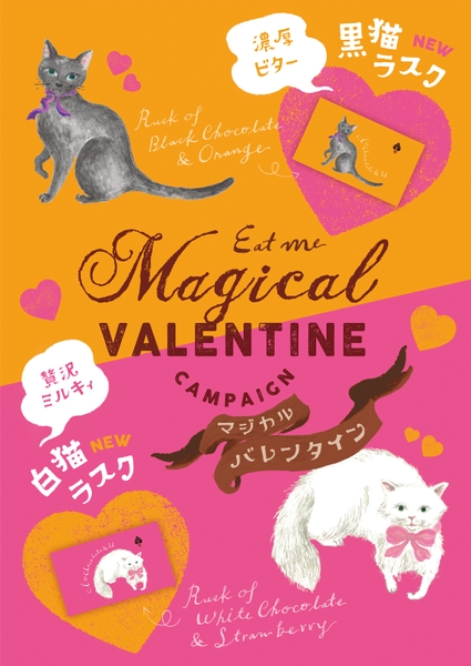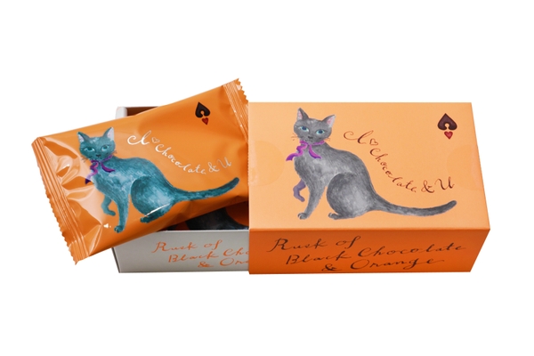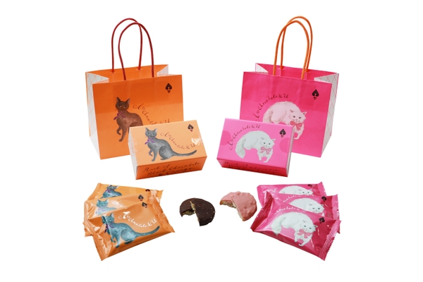 イラストレーター利光春華氏によりデザインされた、黒猫と白猫のイラスト。ピンクとオレンジのおしゃれなギフトパッケージは贈り物にもぴったり。今年のバレンタイン&ホワイトデーの期間限定商品です。