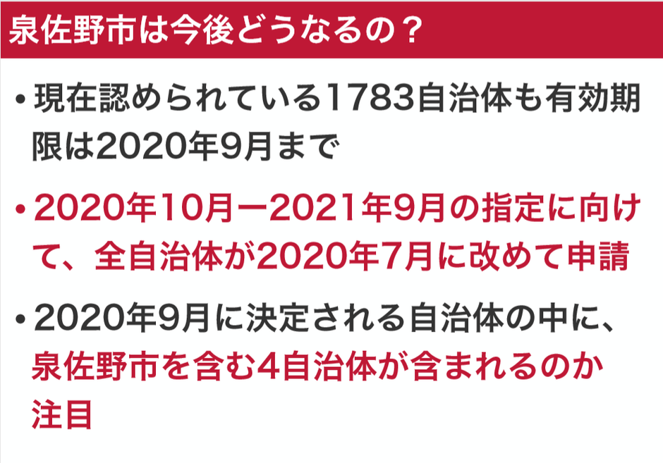 泉佐野市を含む(現在対象外の)4自治体も申請を行うことが予測されますが、2020年9月に決定される指定自治体の中に含まれるのかが注目されます。