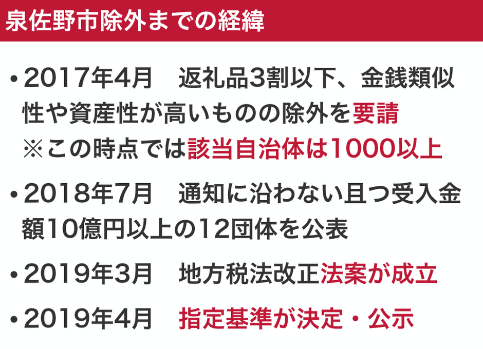 2017年4月から総務省は「返礼品3割以下、金銭類似性や資産性が高いものの除外」を度々要請していきましたが泉佐野市はそれに従いませんでした。