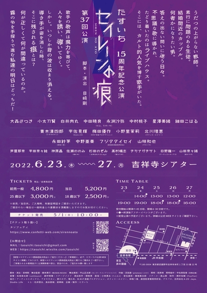 目崎剛が主宰・脚本・演出を務める劇団、たすいちが 15 周年を記念して 2022年6月23日(木)〜2 日(月)に吉祥寺シアター(武蔵野市吉祥寺本町)にて第 37 回公演「セイレーンの痕」を上演いたします。
