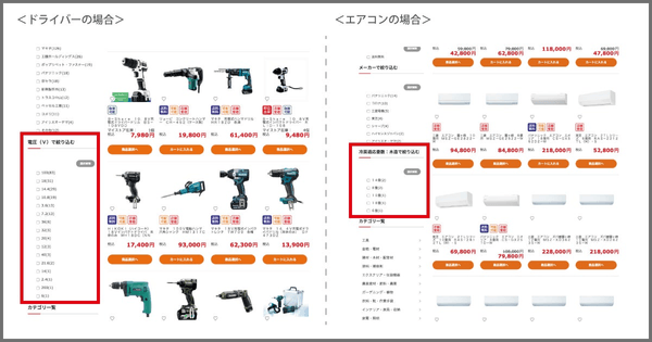 電動工具や家具・照明など、商品の種類にあわせて絞り込み項目が自動で切り替わり、スペックや使用目的に合わせた検索が可能です。