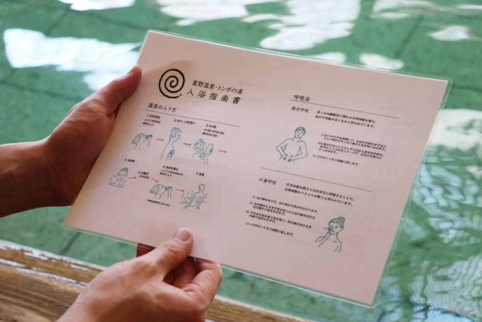散策後は、軽井沢星野エリア内にある「星野温泉 トンボの湯」へ。このプランをお申込みの方には、「入浴指南書」とタオルセットを無料で貸し出します。「入浴指南書」では、基本的な温泉の入り方、呼吸法や入浴中にできる体操を紹介しています。また温泉入浴をしながら見ることができるように、ラミネートフィルム加工が施されています。