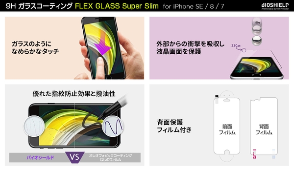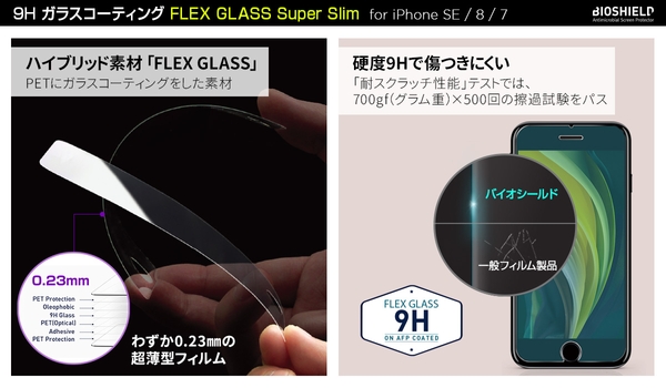 モバイル周辺アクセサリー専門の株式会社ロア・インターナショナル(所在地:東京都新宿区、代表取締 役社長:Ally Won)は、フィルム専門ブランドBIOSHIELD(バイオシールド)から iPhone SE 2 専用超 薄型液晶保護フィルム「9H ガラスコーティング FLEX GLASS Super Slim(フレックスグラス スー パースリム) 」を発売しました。 本製品は、iPhone SE 2 専用の液晶保護フィルムです。超薄型 PET フィルムの上にガラスコーティング しているので本物のガラスのように滑らかな使用感で、万が一割れたときにも飛散しないので安心です。