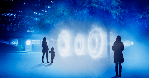 青を基調とした木々のライティングをはじめ、水の都らしい「霧」を使ったインスタレーション、会場を装飾する行灯や傘などはすべて、水をテーマにしたサウンドとシンクロし、当時の潮風や波音を再現しています。