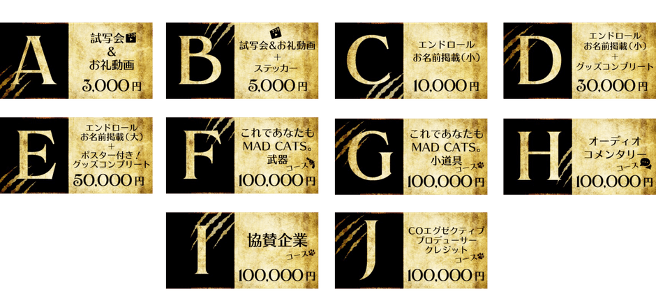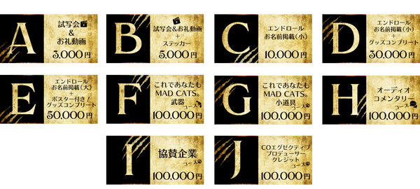 映画「MAD CATS」を愛したくなるような、様々なリターンを用意しています。