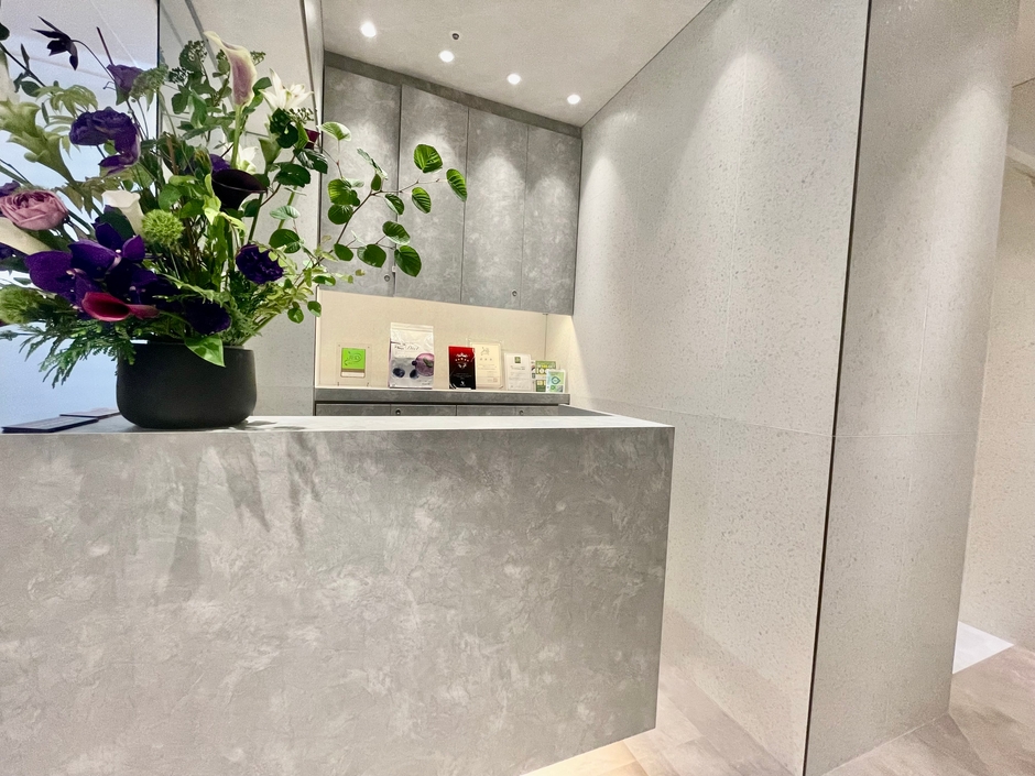 エントランスホールとレセプションは、シックなモノトーンの印象を素材感のある石目模様のタイルで表現しました。