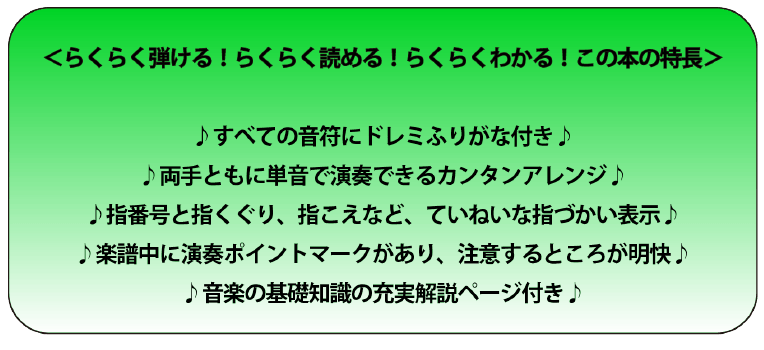 譜読みが苦手でも、ドレミの音名が付いているので、らくらく弾けて楽しめます!