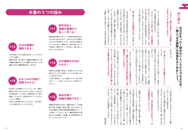 歴史的仮名遣いのポイントや歴史的仮名遣いの五十音から始めるので、古文をはじめて勉強する人や古文が苦手な人でも、古文が必ず読めるようになります。 解説には、岡本先生のキャラが登場! 大事なポイントを先生と一緒に楽しく学ぶことができます。