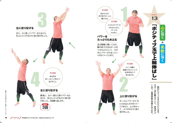 「ポジディブ玉で上腕伸ばし」は、やる気が起きないにおすすめです。大きく体を動かすと血流がよくなり、自律神経が活発になります。