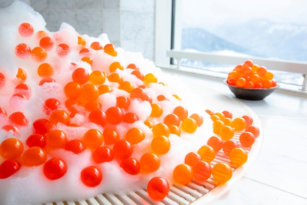 展望ジェットバスでは、いくら丼をイメージしたお風呂を楽しめます。入浴料で泡立ててごはんのような見た目になったお風呂に、いくらを模したボールを乗せると「いくら丼風呂」が完成です。