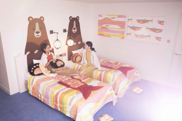 ベッドルームは、川を泳ぐ鮭を表現した空間です。ベッドフレームには、川で鮭を狙うクマが描かれています。鮭の顔がデザインされたナイトキャップと、オレンジ色のパジャマを着ると、まるで鮭になった気分を味わえることも特徴です。