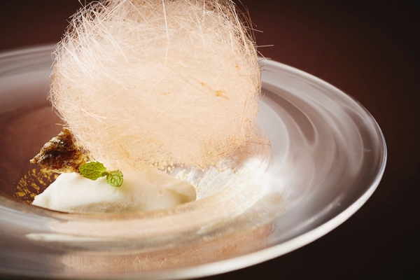 香ばしく揚げた鮭の皮を細かく砕き、リンゴのシャーベットと合わせます。皮の香ばしさとカリッとした食感を味わえるデザートです。
