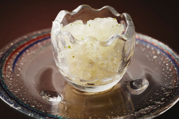 氷頭は、鮭の鼻先の軟骨部分です。氷のように透き通っていることから名づけられました。鮭ディナーでは柑橘風味のグラニテに仕立てます。