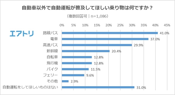 ―「路線バス」(41.0%)、「電車」(37.0%)に続いて「自動運転化してほしいものはない」(31.0%)がランクインしました。