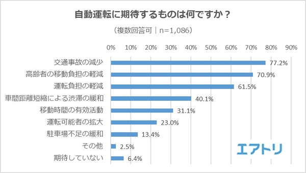 最も多かった回答が「交通事故の減少」(77.2%)、2位以降には「高齢者の移動負担の軽減」(70.9%)、「運転負担の軽減」(61.5%)が続きました。