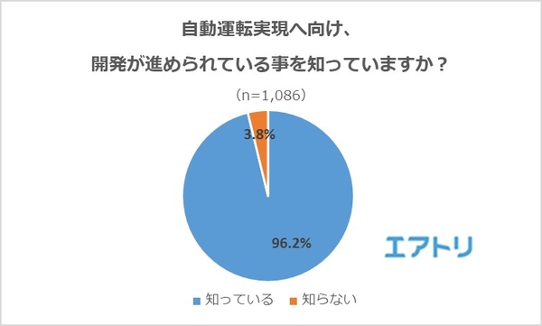 「知っている」と回答したのは96.2%となり、日本において自動運転はもう現実的なものとしてほとんどの人に認識されていることが分かりました。