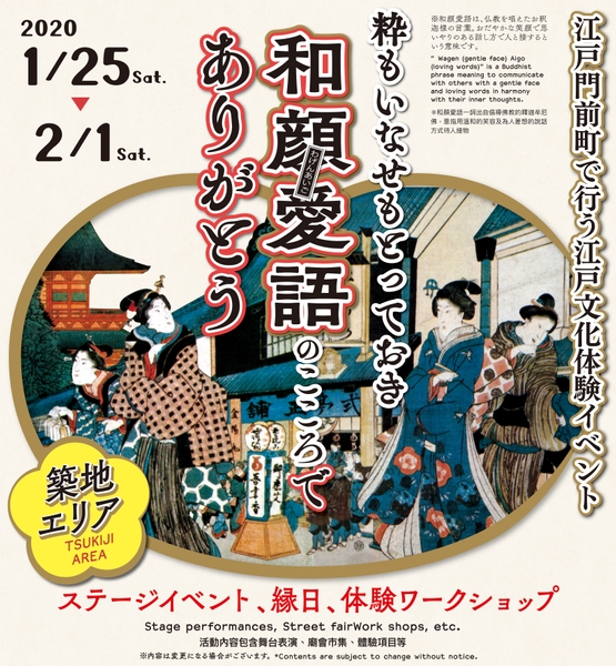 和顔愛語とは、おだやかな笑顔と思いやりのある話し方で人と接するという意味の仏教を唱えたお釈迦様の言葉です。本イベントは、その言葉が息づく浅草、築地の東京を代表する門前町で江戸文化を体験できる無料イベントです。