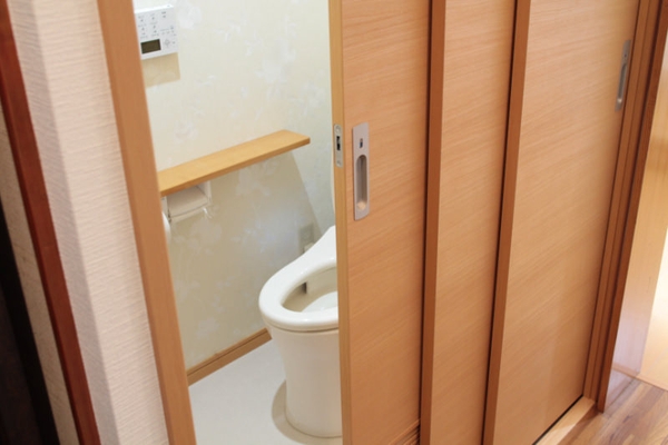 トイレを使用する際にも、開き扉を使用するよりも、開口部が広くなる2枚や3枚の扉が連動して開く、上吊り引き戸などが使われることがあります。上吊り引き戸にすると、高齢者にも配慮した開口部の広いトイレの入り口になります。