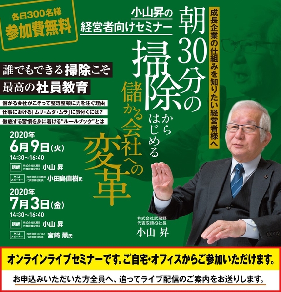 株式会社武蔵野(東京都小金井市、以下武蔵野)の代表取締役社長 小山昇が、自社で30年以上続けている最強の社員教育【朝30分の掃除】について6月9日(火)、7月3日(金)に無料オンラインライブセミナーを開催します。講義中に視聴者の方からの質問にお答えする時間も設けています。インターネット上で気軽に質問でき、テレワークで社内教育が従来通り行えない方もお好きな場所からご視聴可能です。