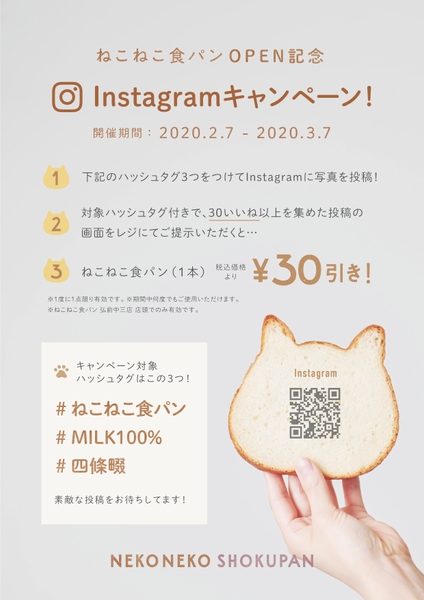 ご自身のインスタグラムに下記の3つのハッシュタグを付けて「ねこねこ食パン」を投稿していただき、「♥30いいね」をゲットすると、ねこねこ食パン1斤が30円引き!