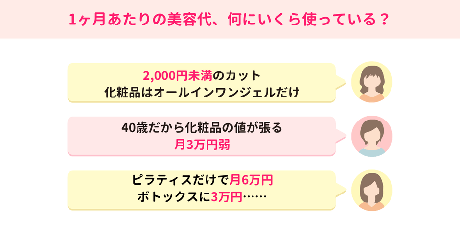 『基礎化粧品4,000円、ファンデ2,000円、美容室は2ヶ月に1度6,000円、サプリ3,000円。コンスタントに1万円強だけれど、年に1~2回ヒアルロン酸に10万~20万円』