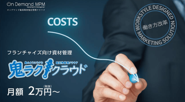 「鬼ラク!クラウド」は、月額2万円から始めることができる、ID数100名までの中規模クラス向けのクラウドシステムです。一般的なECサイトのように資材発注を各拠点から手軽に行うことができます。注文された資材は自動的に発注され、また在庫アイテムであれば直接倉庫に発送依頼が入ります。リアルタイム在庫数表示により、在庫数確認が常時可能となります。また、在庫数が少なくなると自動的に管理者にアラートが送信され、在庫追加のタイミングをお知らせいたします。さらにチラシやカタログ等の販促印刷ツールはオンデマンド印刷に移行することで、倉庫保管の必要も無くなり、廃棄ロスも0に近づきます。 あわせてオプション機能のeカタログサービスを活用することにより、加盟店の従業員向けマニュアルの電子化や、教育セミナーの電子化が可能となり、集合教育のコスト削減と育成パフォーマンスの向上を実現いたします。