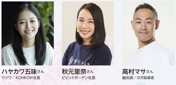 国際政治学者の三浦瑠麗さんは、「ジェンダートランスフォーメーション」の大切さを指摘。時給850円の非正規の立場を脱して、今のキャリアに至った経緯を振り返りつつ、20~30代の女性たちに「自分の価値の高め方」を提案します。鍼灸師でヨガ指導者の高村マサさんは、セミナー『東洋医学のチカラで不調を和らげる!おうちで体験!「カラダ巡りヨガ」』を実施。タレントで女優のMEGUMIさんはアイケアセミナーで「親にとっての、子どもの目の健康」を学びます。また、ヨガクリエイターで、Syaraaya代官山主宰のayaさんは、デスクワークが増えたコロナ禍にもぴったりの、自宅ですぐに実践できるストレッチを実演します。