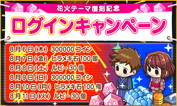 また、今回の「花火テーマ」復刻を記念し、8月6日(木)~8月11日(木)23:59の期間に毎日ログインすることで、ゲーム内の報酬がプレゼントされる「ログインキャンペーン」を実施いたします。
