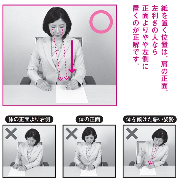 ですが、これは実は間違い。紙を正面に置くと、自分の書いている文字が手で隠れてしまうので、美しい字が書けません。正しい位置は正面より左側。利き腕の延長線上です。