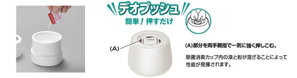 従来の安定化二酸化塩素の除菌・消臭剤は、設置前に粉をふりかける作業があり一手間かかっておりましたが(写真左)、本製品はより手軽に除菌・消臭できる構造にしています。中でも『ドクターデオ 部屋のウイルス除去 置きタイプ(DSD30)』は、ワンプッシュですぐに使用できる『デオプッシュ』機構(特許出願中)を採用しています(写真右)。