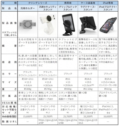 「グリップ&ドックスタンド」は、タブレットにグリップ(取っ手)を取り付けることでドックスタンドに接続可能で、携帯性と防犯性の両立を実現しました。衝撃吸収ケースを装着したままセットできる「ラグドケース・スタンド」、iPad対応の「プロテクト・スタンド」も同時発売します。いずれも盗難防止機構を備え、デザイン性と堅牢性を両立させています。