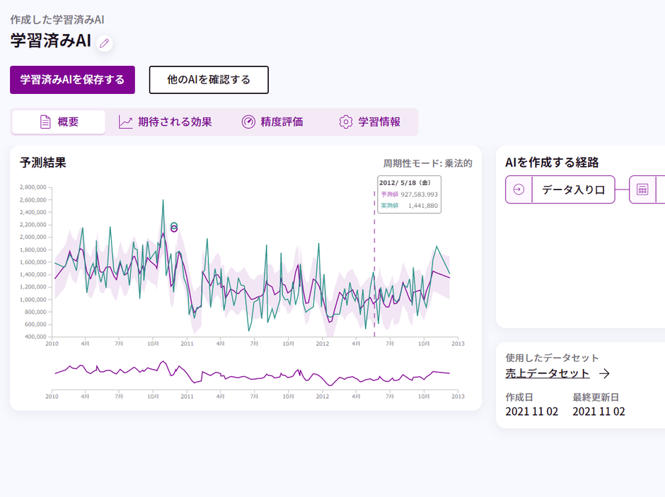 AIを学習すると、実績値と予測値を見ることができます。