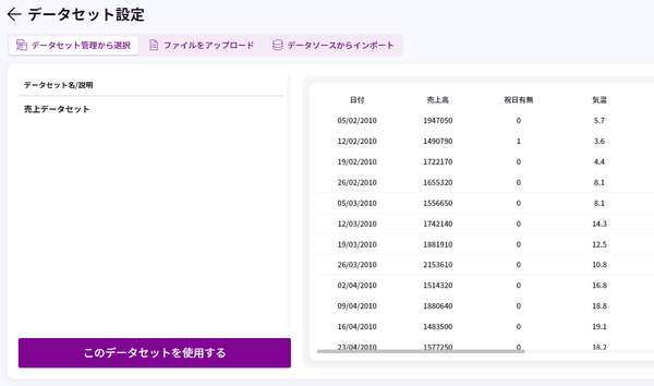 データのアップロード まずは、予測をする上での材料となるデータをアップロードします。