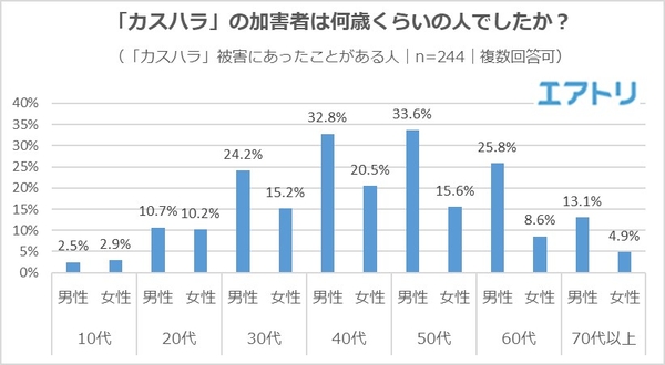 「カスハラ」被害にあったことがある人に対し、加害者の予想年齢を聞いたところ、最も多かったのが「50代男性」、続いて「40代男性」「60代男性」と比較的年配層が上位を占めました。上位は男性が独占の一方で、女性の加害者も一定数いるようで、「カスハラ」被害者の20.5%が「40代女性」から被害を受けたと回答しました。